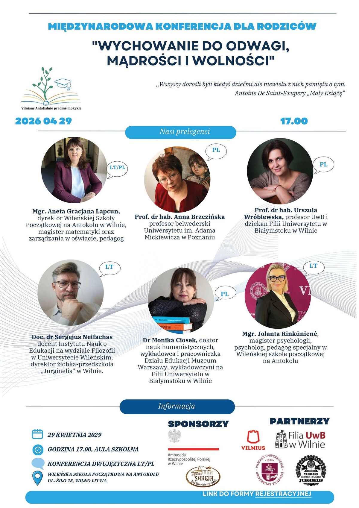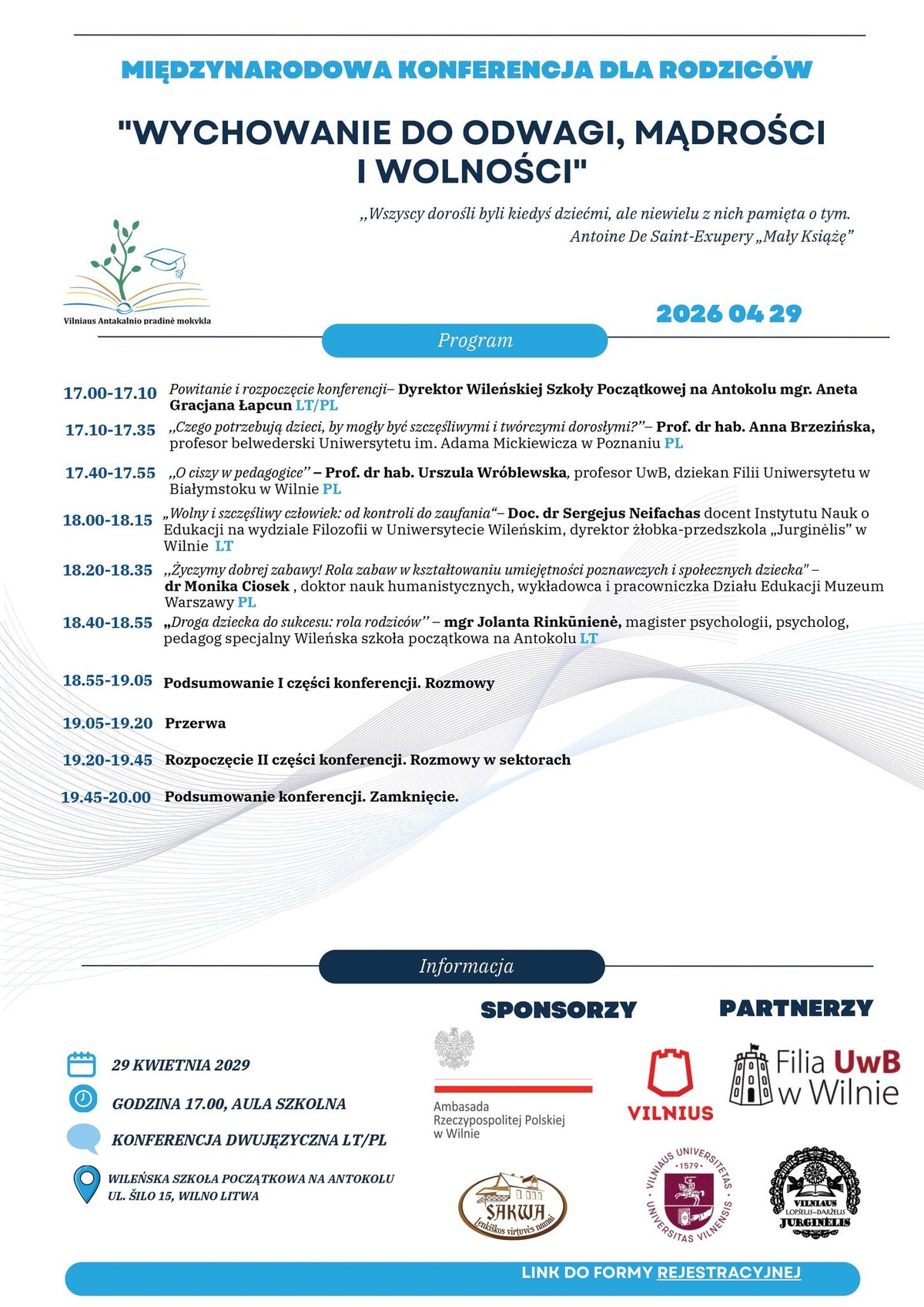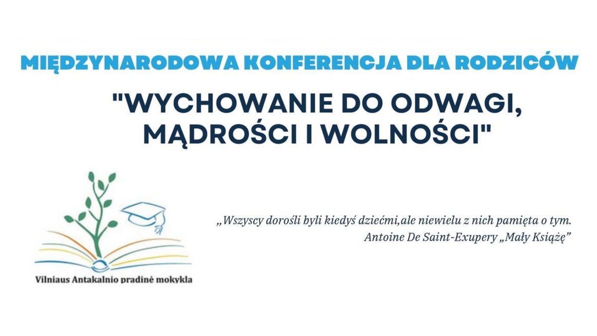 Wileńska Szkoła Początkowa na Antokolu serdecznie zaprasza na międzynarodową konferencję dla rodziców pt. „Wychowanie do odwagi, mądrości i wolności”, która odbędzie się 29 kwietnia o godzinie 17:00.