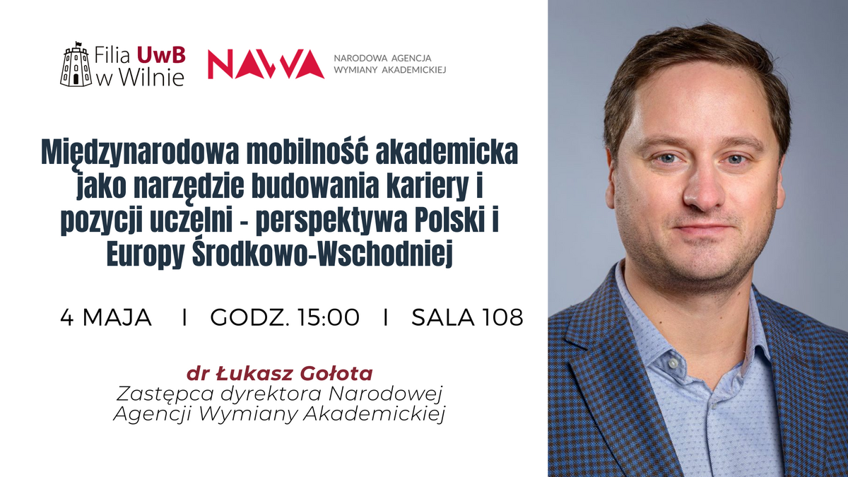 4 maja o godz. 15:00 w sali 108 Filii UwB w Wilnie odbędzie się spotkanie z zastępcą dyrektora Narodowej Agencji Wymiany Akademickiej (NAWA), dr. Łukaszem Gołotą, pt. „Międzynarodowa mobilność akademicka jako narzędzie budowania kariery i pozycji uczelni – perspektywa Polski i Europy Środkowo-Wschodniej”.